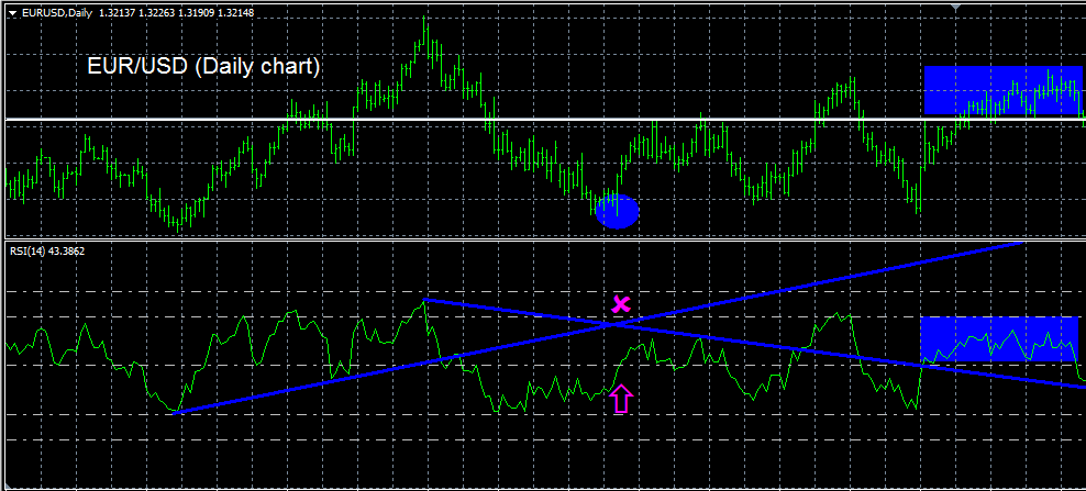 Na primeru grafikona EUR/USD (D1 chart) dat je prikaz analize preseka trend linija na grafikonu indikatora (linije označene plavom bojom povezuju karakteristična dna i vrhove linije RSI oscilatora) pomoću koje se pouzdano zapaža promena glavnog trenda (dnevni grafikon pokazuje ponašanje dugoročnog trenda za period od nekoliko sedmica) pa se na osnovu toga mogu odrediti trenuci za ulazak u pozicije (kupovne i prodajne) na manjim vremenskim intervalima (H4, H1, M30 itd.). Istovremeno se na grafikonu RSI oscilatora uočava da linija indikatora probija nivo 50 i kreće se naviše što posebno potvrđuje nadolazeći rastući trend u odnosu na inicijalni trend po kome se cena do tada kretala. Naime, nivo 50 predstavlja srednju vrednost indeksa relativne snage i tretira se kao vrlo važna linija otpora i podrške kretanjima vrednosti indeksa. U praksi se često koristi analiza nivoa 50, pored ostalih važnih nivoa (nivoi 30 i 70) gde se rastućim trendom smatra dostizanje vrednosti indikatora iznad nivoa 50, i obrnuto, padajući trend prate vrednosti linije indikatora ispod nivoa 50. Tako se na grafikonu RSI indikatora uočava kretanje linije iznad nivoa 50 koje odgovara periodu cenovnog kretanja u rastućem trendu (na grafikonu: podudarnost pravougaonika označenih plavom bojom) iznad karakteristične linije trenda koja je ranije zapažena kao važna linija podrške (označena belom bojom na cenovnom grafikonu) itd.